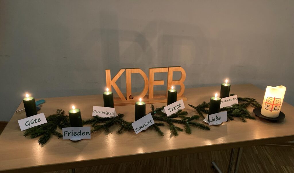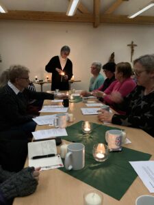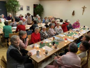 Wir freuten uns zu unserer Adventsfeier am 8. Dezember 47 Frauen und einen Mann begrüßen zu dürfen. Unsere geistliche Beirätin Karin Schmitt hatte die spirituelle Feier „Im Dunkel leuchtet ein Licht“ vorbereitet. Für das leibliche Wohl sorgte Karin Würtenberger mit Team und einigen Frauen, die kleine Leckereien mitgebracht hatten.