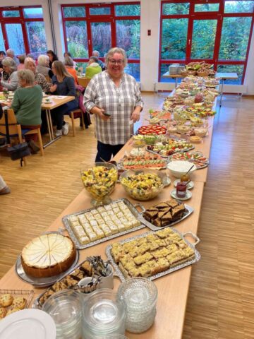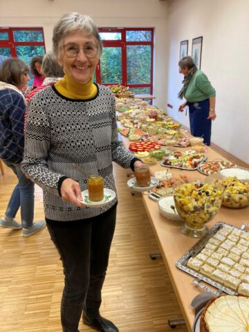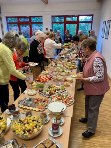 Im Pfarrsaal waren die Tische schön eingedeckt und es erwartete die Gäste ein exquisites Buffet, das vom Küchenteam rund um Karin Würtenberger vorbereitet worden war: Auf appetitlich hergerichteten Platten konnte zwischen Wurst, Käse, Lachs und Lachsrollen gewählt werden. Zwischendurch schmeckte ein Blätterteighäppchen – und dann lockten die vielen selbstgemachten Aufstriche, die sowohl mit Gemüsesticks oder Brot und Brötchen probiert wurden, immer wieder zu einem weiteren Gang ans Buffet. Abgerundet wurde das Frühstück mit Obstsalat und Quark oder einem Stück Kuchen.