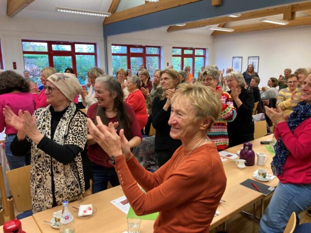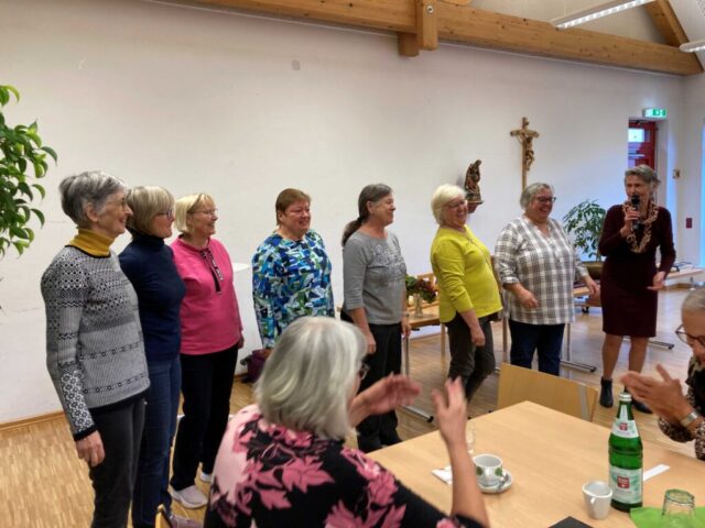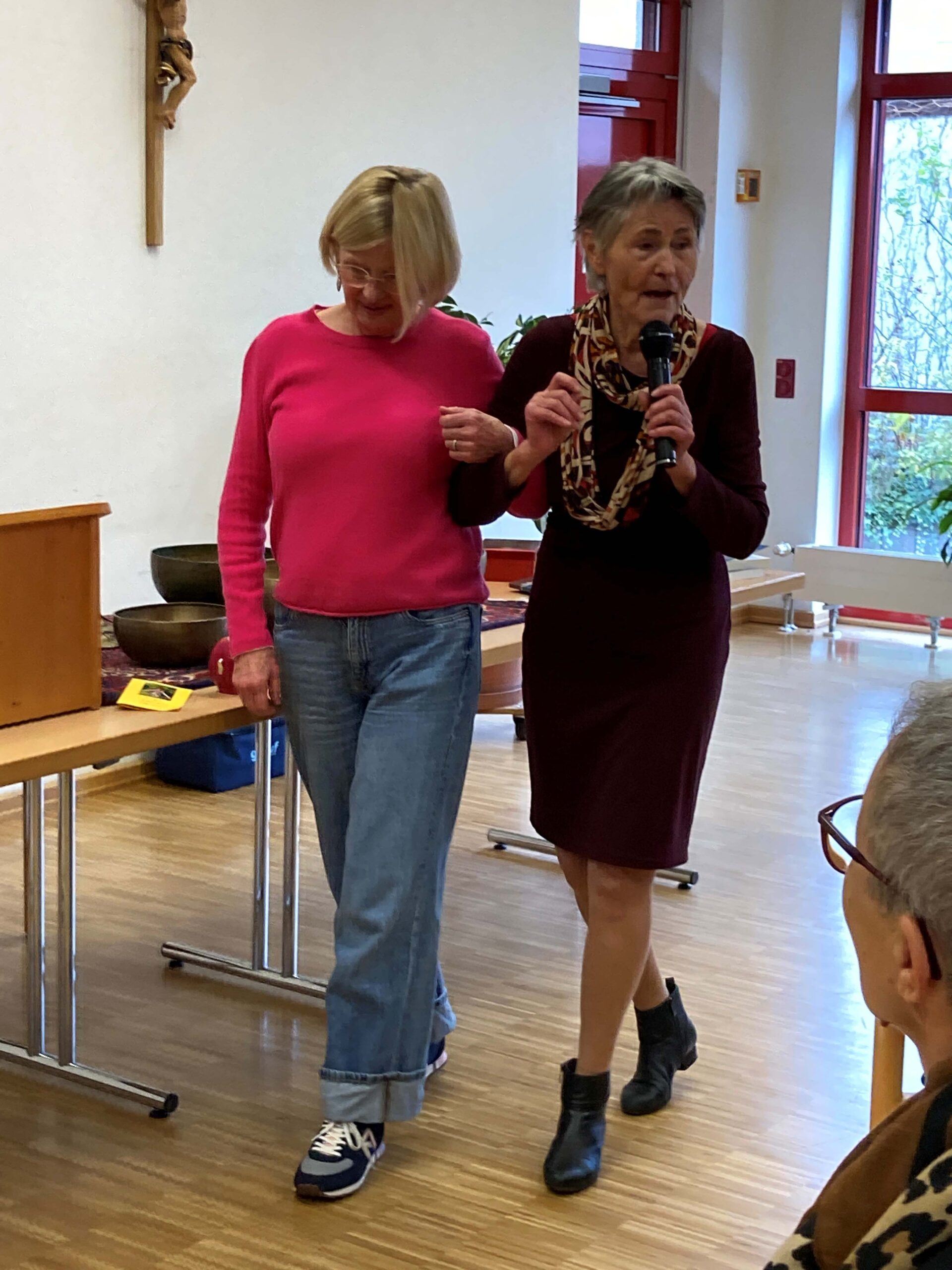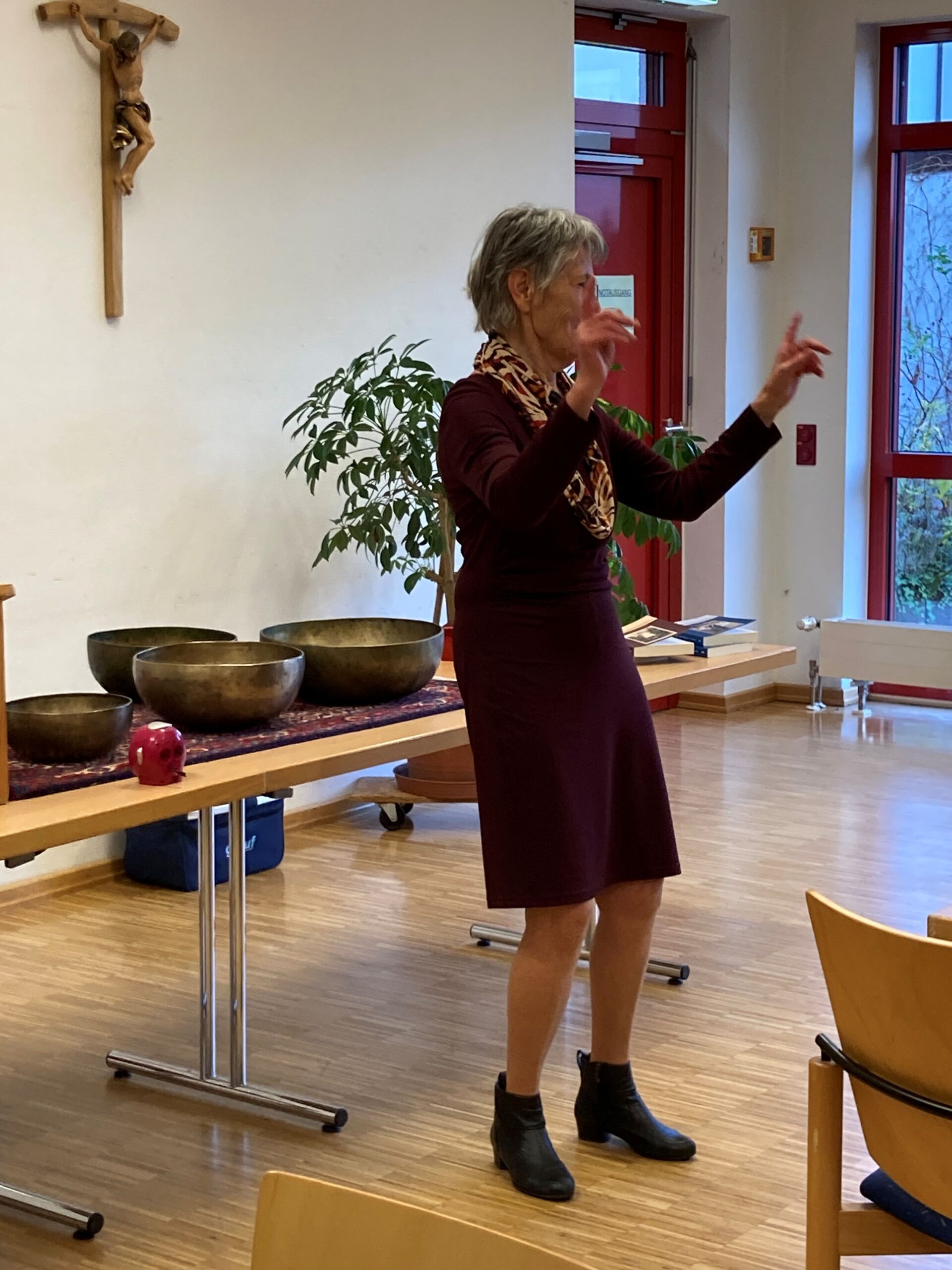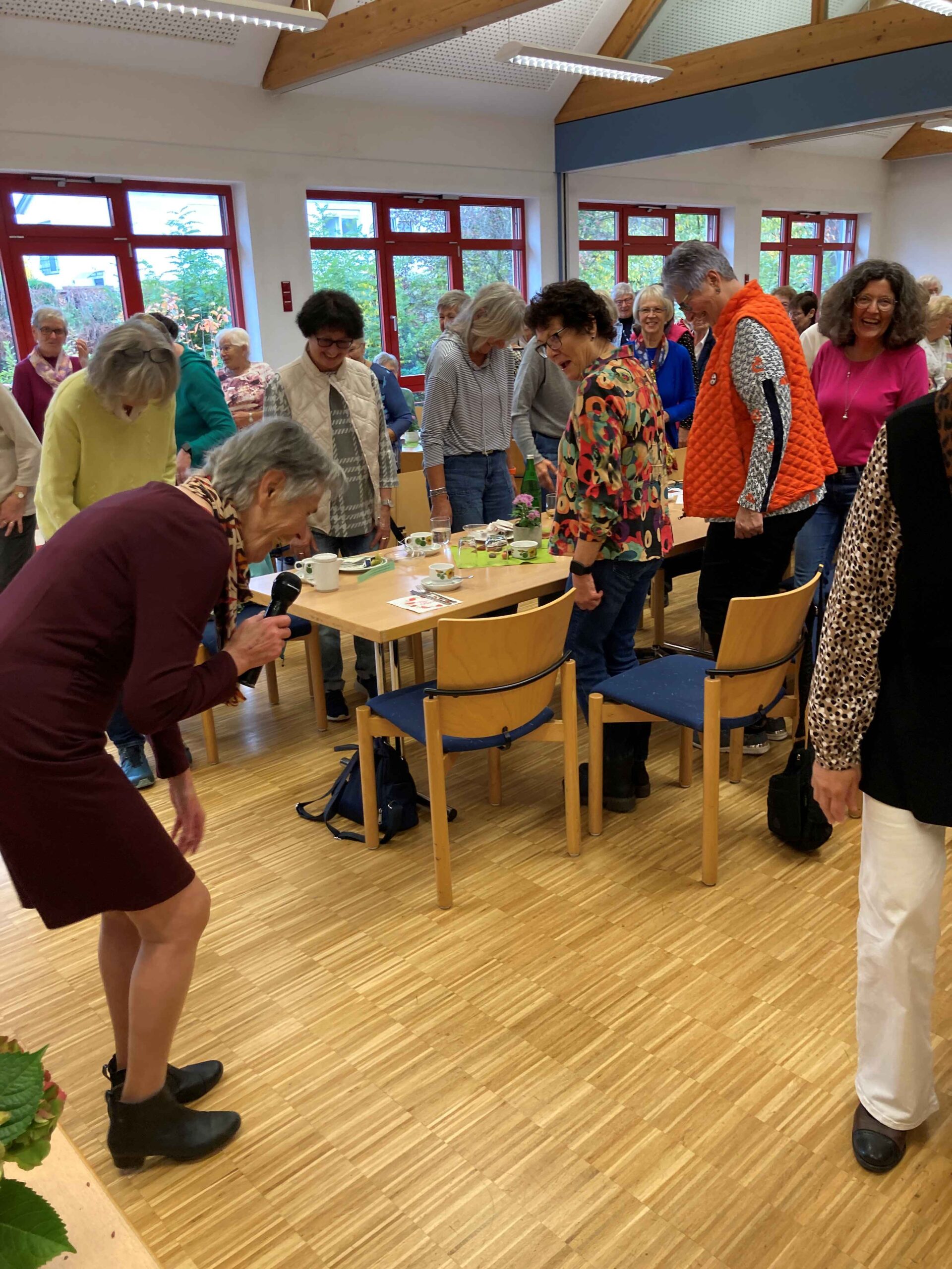 Danach wurde der Referentin Renate Förster aus Gerolzhofen, die auch Gesundheitsberaterin, Autorin und Klangpädagogin ist, ein Ständchen zu ihrem runden Geburtstag gebracht. Kaum war der letzte Ton verklungen, stieg sie auch schon in ihren Vortrag ein. Munter und bewusst zu leben, ist sicherlich ein Grund für die übersprühende Lebendigkeit von Renate Förster, die sogleich im Raum spürbar wurde. Anekdoten und Begebenheiten aus ihrem Alltag gaben Beispiele für ihre Sichtweise auf jeden neuen Tag, aufgelockert durch Dehnübungen mit gemeinsamen Gesang, Klangschalenmeditationen sowie Lachyoga. Verstand und Seele in Einklang zu bringen, dankbar jeden Tag neu beginnen und in scheinbaren eigenen Mängeln auch das Positive zu sehen, war ihr Ratschlag für uns: Lebe jetzt und warte nicht auf später, denn das Leben ist so kurz. Mit einem Lächeln dem Tag trotzen, egal was er bringt, setzt ungeahnte Energien frei. Diese Energie führt Renate Förster jetzt sogar bis in die Sternstunden-Gala des BR am 12.12.25, wofür sie um Spenden bat.