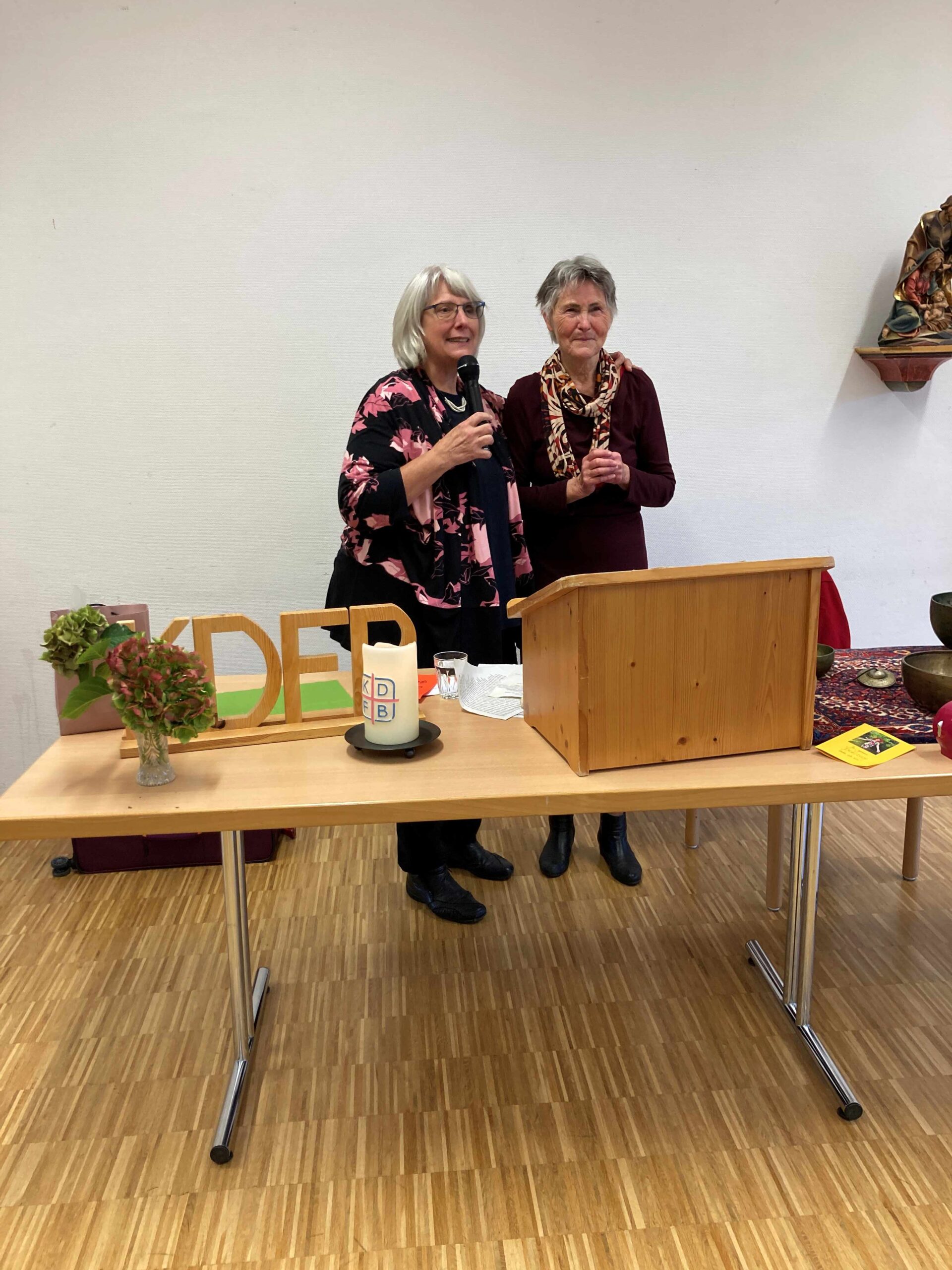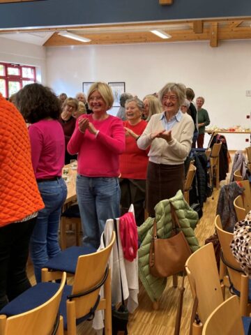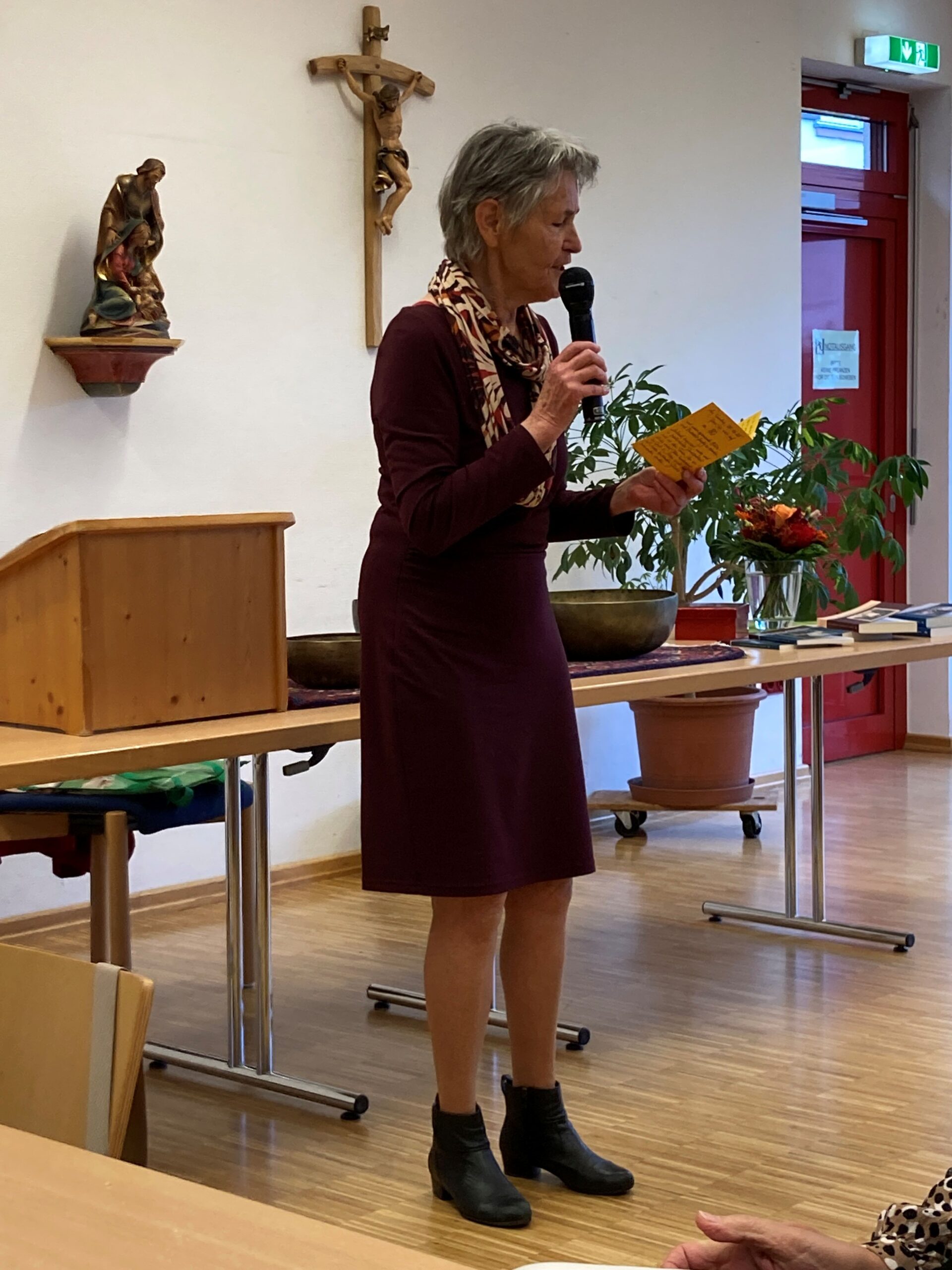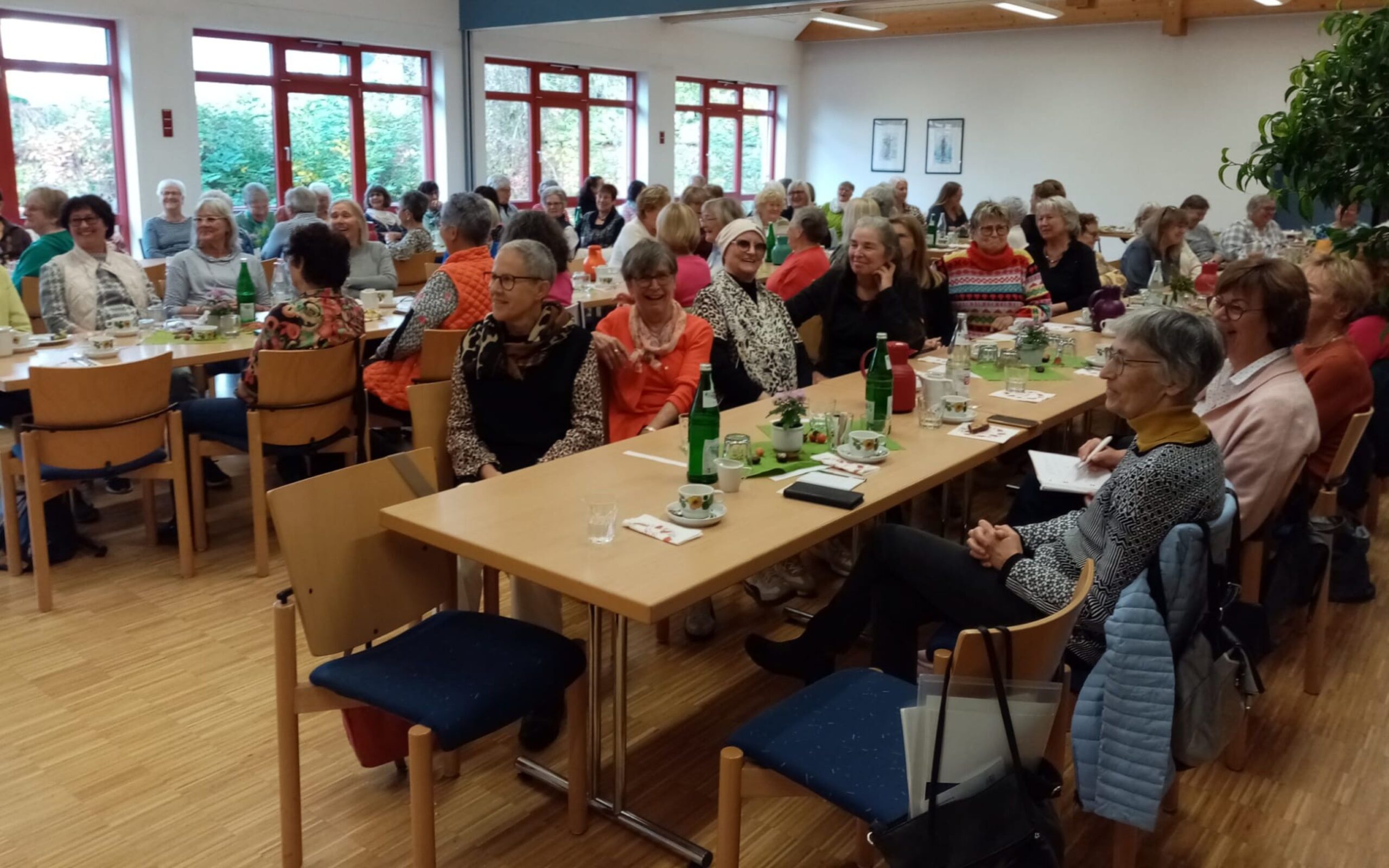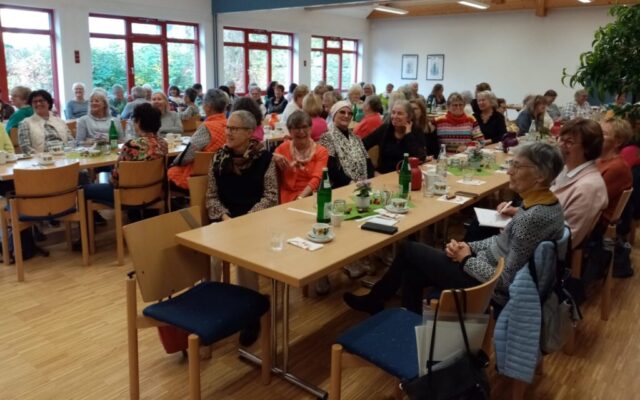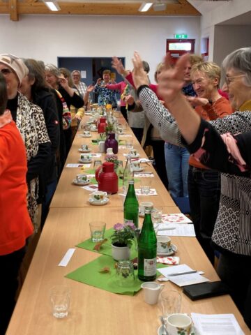 Danach wurde der Referentin Renate Förster aus Gerolzhofen, die auch Gesundheitsberaterin, Autorin und Klangpädagogin ist, ein Ständchen zu ihrem runden Geburtstag gebracht. Kaum war der letzte Ton verklungen, stieg sie auch schon in ihren Vortrag ein. Munter und bewusst zu leben, ist sicherlich ein Grund für die übersprühende Lebendigkeit von Renate Förster, die sogleich im Raum spürbar wurde. Anekdoten und Begebenheiten aus ihrem Alltag gaben Beispiele für ihre Sichtweise auf jeden neuen Tag, aufgelockert durch Dehnübungen mit gemeinsamen Gesang, Klangschalenmeditationen sowie Lachyoga. Verstand und Seele in Einklang zu bringen, dankbar jeden Tag neu beginnen und in scheinbaren eigenen Mängeln auch das Positive zu sehen, war ihr Ratschlag für uns: Lebe jetzt und warte nicht auf später, denn das Leben ist so kurz. Mit einem Lächeln dem Tag trotzen, egal was er bringt, setzt ungeahnte Energien frei. Diese Energie führt Renate Förster jetzt sogar bis in die Sternstunden-Gala des BR am 12.12.25, wofür sie um Spenden bat.