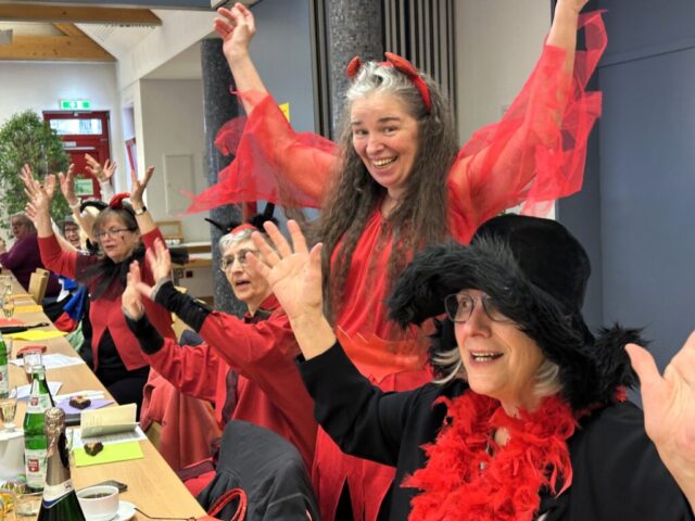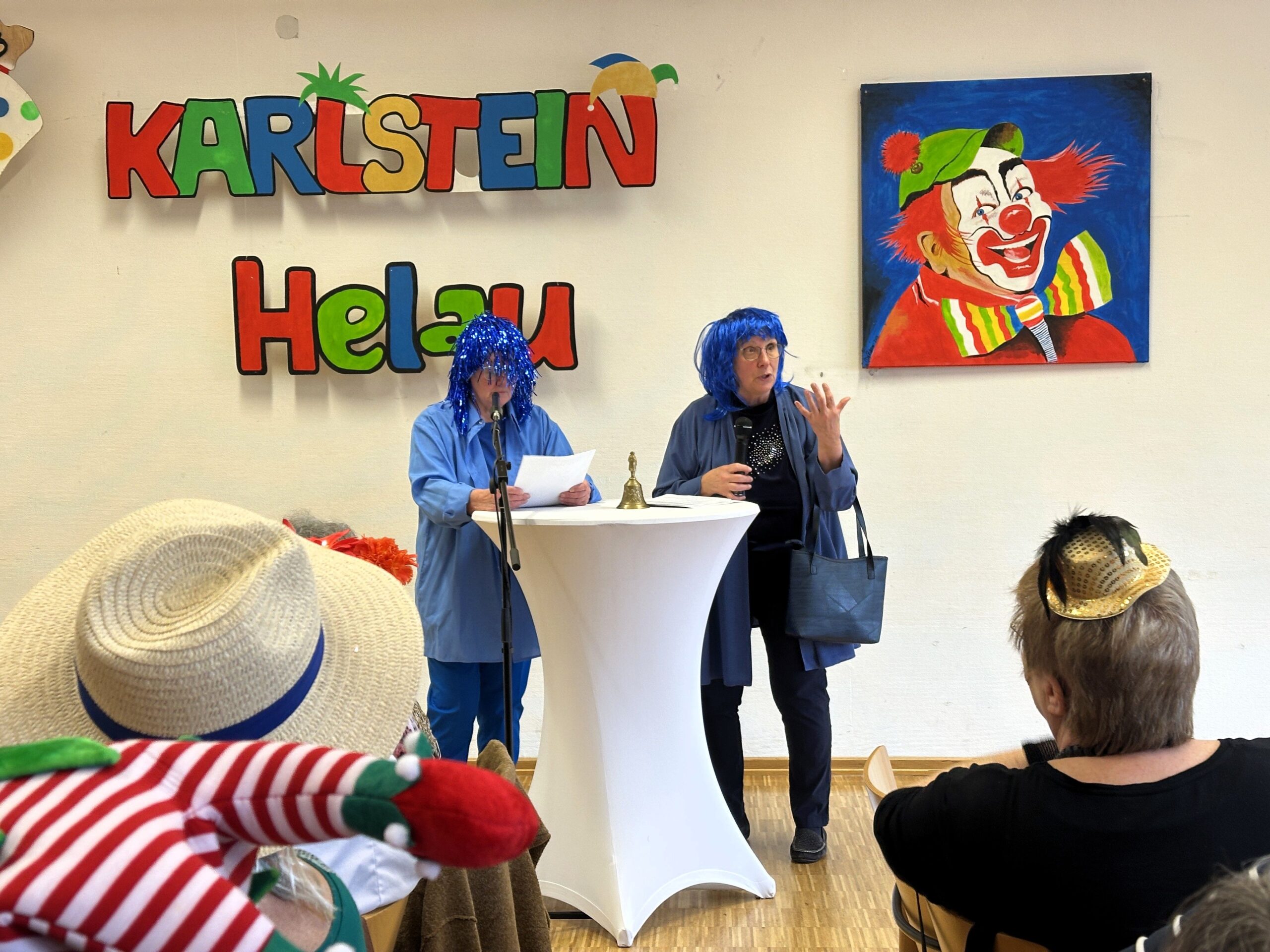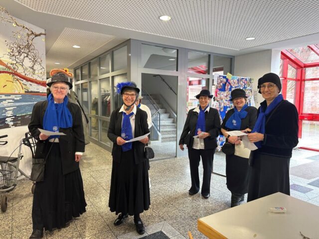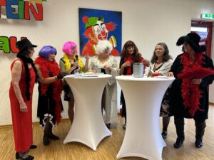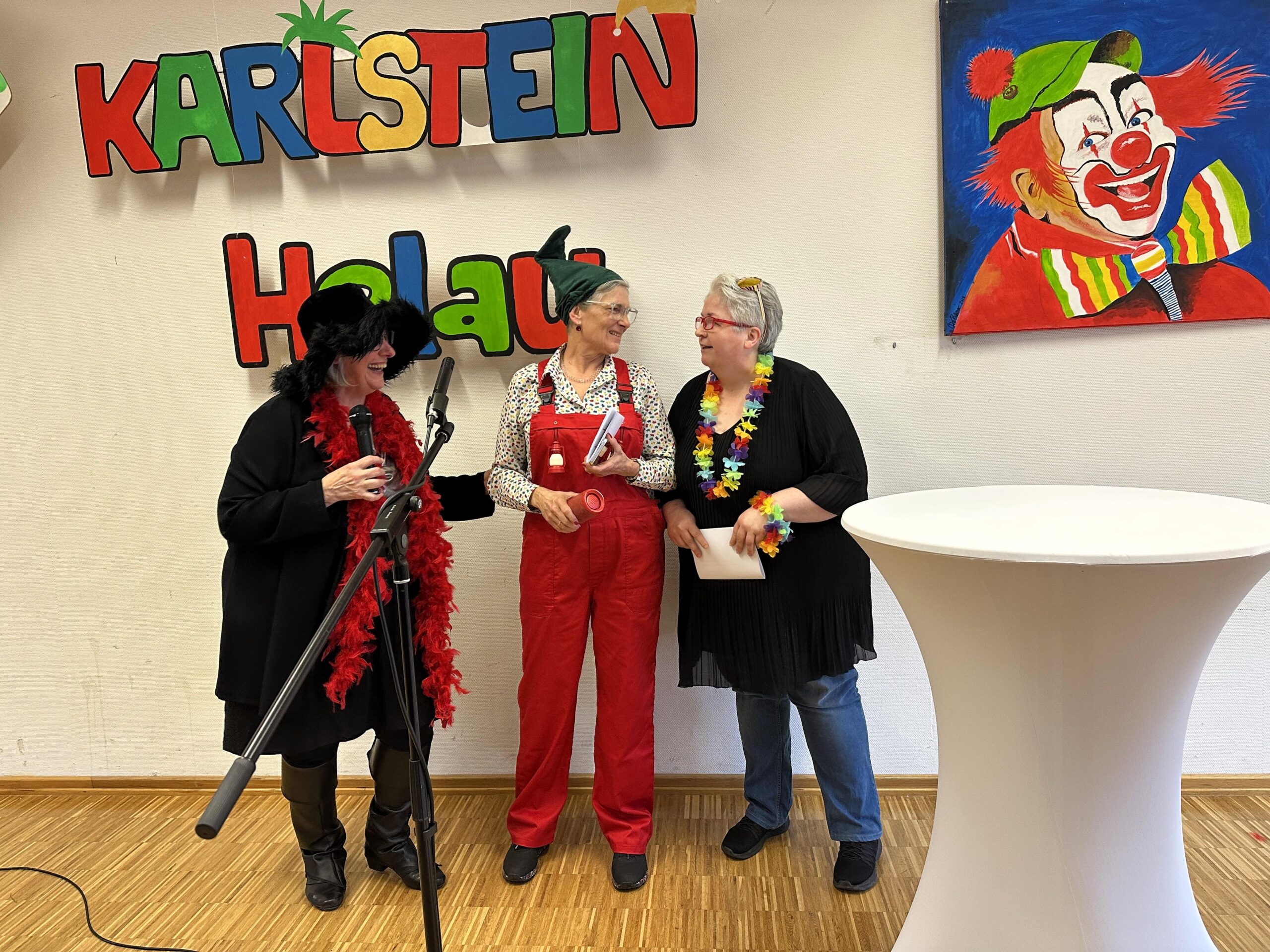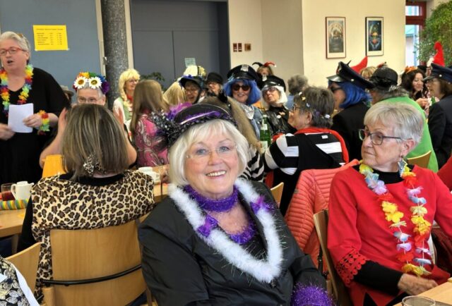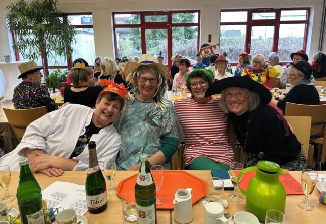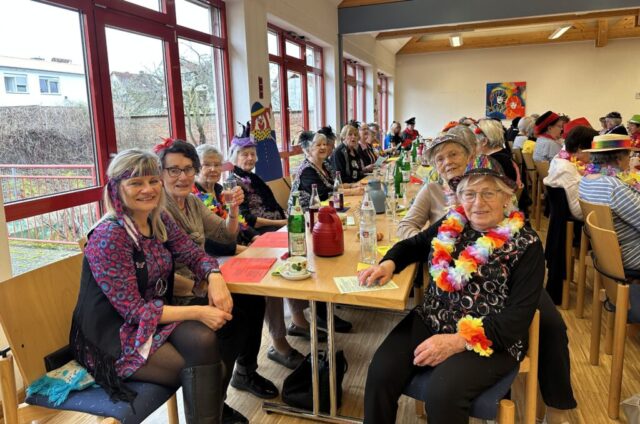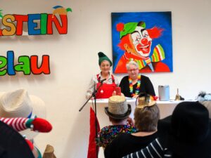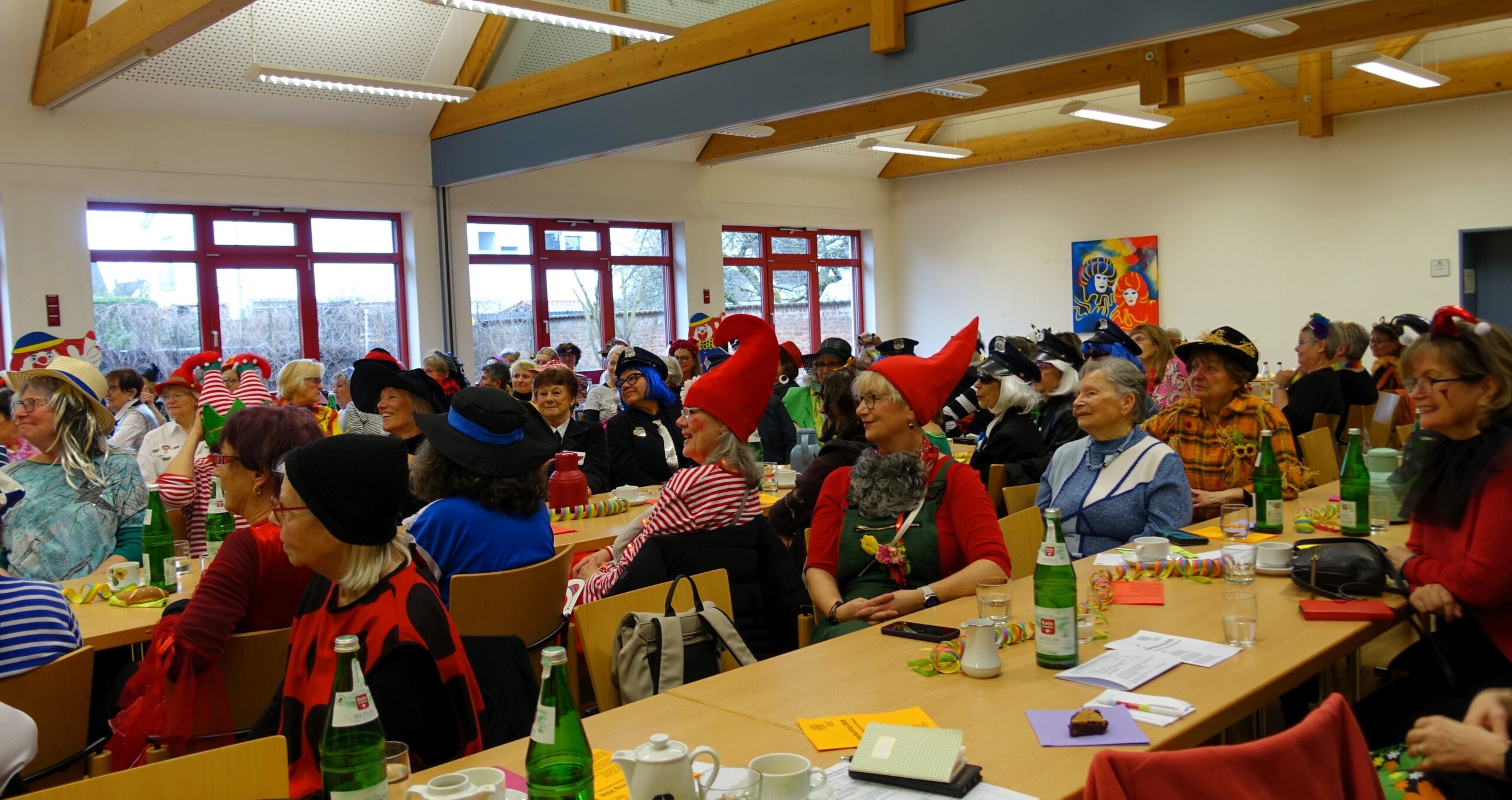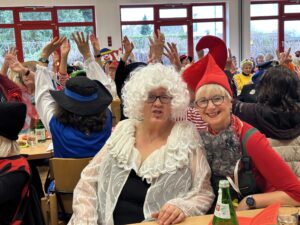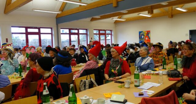 einer Putzfrau“ darbot, welche Schwierigkeiten sie mit Mann und pubertierender Tochter hat. Kaum war der Applaus verklungen, rundeten „Frau Schussel“ (Doris Lindner) und „Frau Meckermann“ (Uschi Stenger) den Vormittag ab und berichteten von den Merkwürdigkeiten des letzten Jahres und ihrer Sicht auf Orts- und Weltgeschehen. Mit einem gemeinsamen Gruppenbild aller Aktiven und letzten Liedern endete in ausgelassener Stimmung die Veranstaltung.