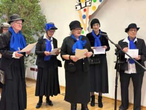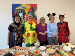 Die 1. Vorsitzende Uschi Stenger begrüßte die Gäste mit launigen Worten und Liedproben, unterstützt von Dorle Golombowski und weiteren Sängerinnen, bevor Karin Würtenberger, die Leiterin des Küchenteams, den Sturm aufs Büffet eröffnete. Und das Team hatte in hervorragender Weise allerhand Leckeres vorbereitet: Neben einer Vielzahl an Aufstrichen gab es Platten mit Wurst und Käse, mit verschiedenem Finger Food und mit Spinatrollen. Gemüsesticks zum Dippen standen genauso wie Obstsalat und Quark bereit. Zum Abschluss lockte dann noch Süßes.